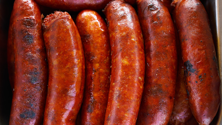 You can always pick up a container of regular ground pork from the meat aisle of your grocery store. Or, you can take things a step further by adding a more flavorful ground pork product to your sloppy Joes, like Mexican chorizo. It's not the same as Spanish chorizo because it isn't cured, smoked, or easily sliced. Rather, it crumbles, thanks to the addition of extra pork fat, and it's also brimming with seasonings like chilis, vinegar, and garlic. This flavorful sausage will easily perk up your recipe and bring a tongue-tingling flavor that will have you coming back for seconds, whether you're making saucy sloppy Joe tacos or a sloppy Joe grilled cheese.