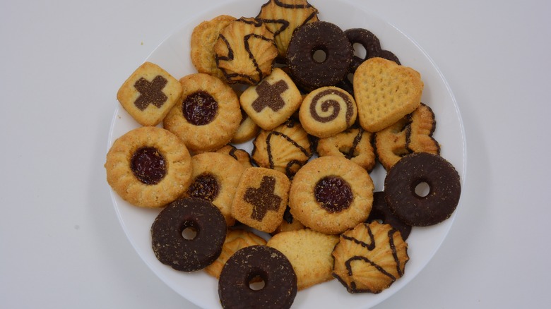When you're ready to start decorating, use a piping bag or a plastic bag with a small hole cut into a corner to trace tempered chocolate across the surface of your cookies. If your hand is unsteady, practice drawing swirls onto a piece of parchment paper or plastic cutting board before attempting your cookie designs. Layer foundations of white chocolate and add swirls of darker chocolate on top, or sprinkle edible gold flakes and decorating sprinkles on top of the chocolate for an elevated touch.