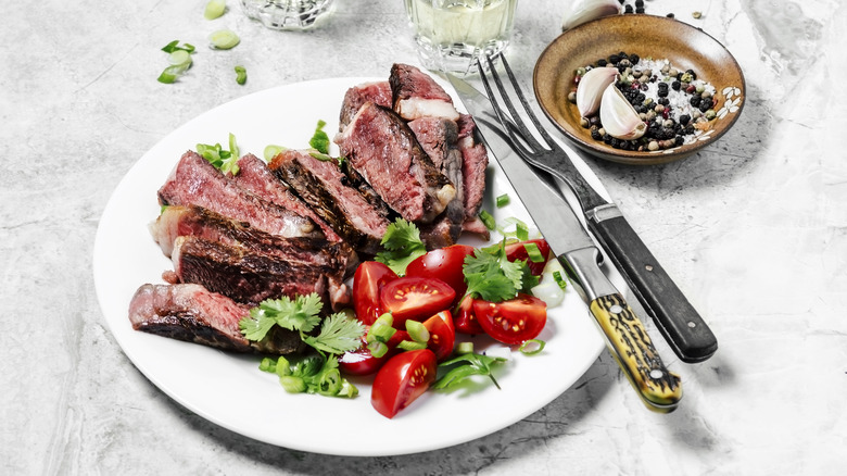 Sirloin will make a great steak, but you can get a little bit more creative. Sirloin also does well over high heat on the grill or stovetop, but you'll need to be more precise with the timing and temperature to make sure it doesn't dry out. You should also utilize tips for juicy sirloin steaks, like marinating to squeeze in more flavor. As an affordable cut, sliced strips of sirloin are nice for things like fajitas and stir-fry dishes, or for quick breakfasts like steak and eggs. With their solid balance between taste and price, sirloin steaks may just be the most versatile steak in your cooking arsenal.