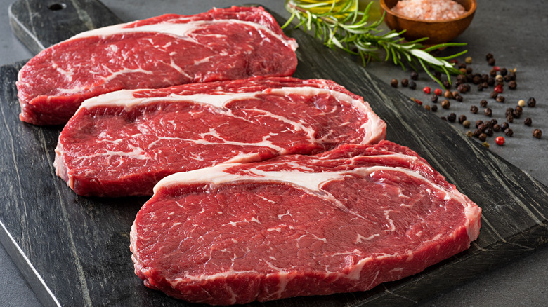 Even on the shelf, sirloin and ribeye are going to present you with big differences because of how they are classified and labeled. As noted before, the sirloin is a large cut with lots of different steaks to choose from, and while they share some key characteristics, they aren't identical. While the bottom sirloin makes good roasts, there are also cuts like the bavette steak, which is a flavorful but tough cut similar to flank steak. The top sirloin is on the lean side but still has enough fat to be juicy and make good seared or grilled steaks. One lesser known sirloin steak is called the coulotte steak. Cut from the sirloin cap, coulette is an even better marbled form of sirloin steak.
