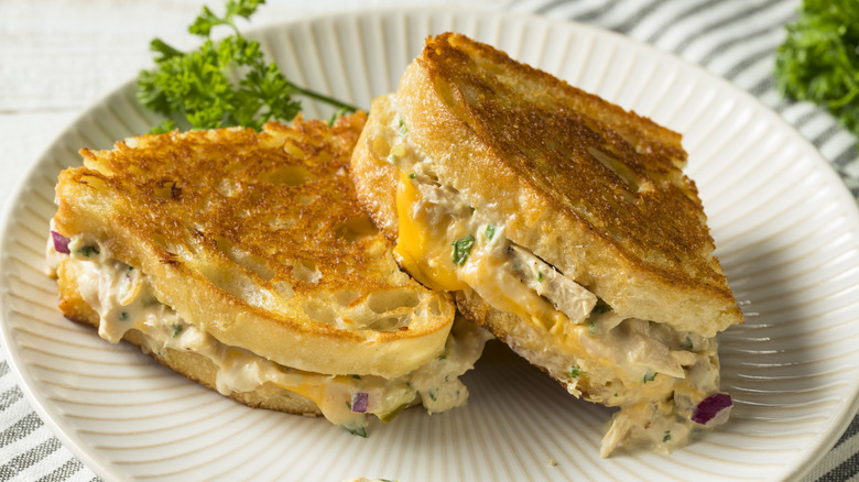 The key to picking the right type of cheese is to select one that melts well. It is called a tuna melt, after all. A gooey, warm cheese pull contrasts deliciously with the cold and creamy tuna salad — so don't get it wrong. The reason why some cheeses melt better than others has to do with softness, fat, and water content so go for an option that fits that bill. Some options that work are American for a classic take, mozzarella, Gruyère for salty and nutty flavors, or provolone if you prefer a sharp cheese. For a more unique take, consider pepper Jack for heat or brie for richness (just don't forget to remove the rind).