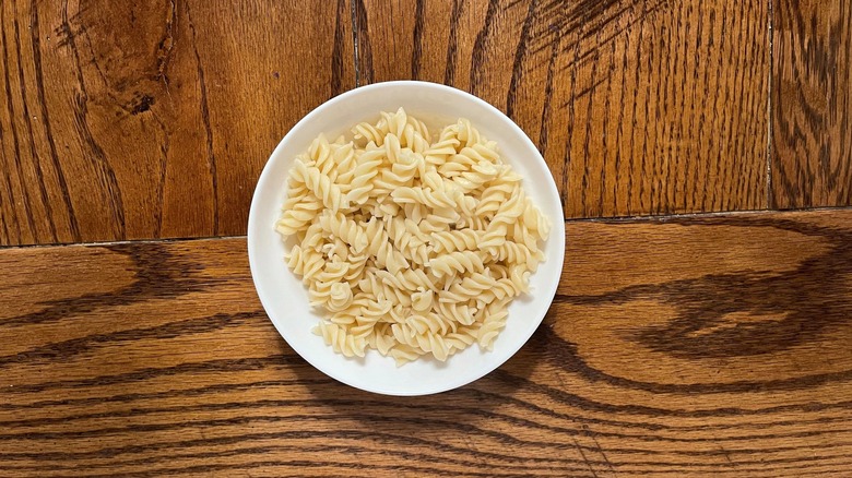 As far as gluten-free pasta goes, Trader Joe's lands pretty much in the middle of the pack (hence its ranking placement). It's not quick to get mushy, but it also isn't perfectly al dente and has a tad more firmness than some other gluten-free options on this list. Additionally, while the taste isn't exactly overbearing, per se, you can still tell it's not wheat pasta after one bite. Now, to be fair, this isn't really a bad thing. In fact, while it won't fool any gluten-loving friends or family who're served this, the overall flavor is pretty mild, and essentially what you'd expect from brown rice.