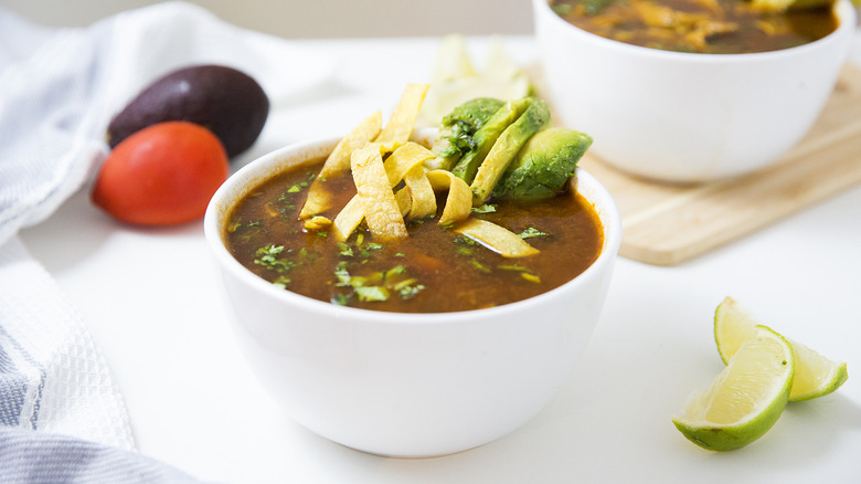 - Ladle the soup into individual bowls and top with tortilla strips, avocado, cilantro, lime juice, and cheese if desired.