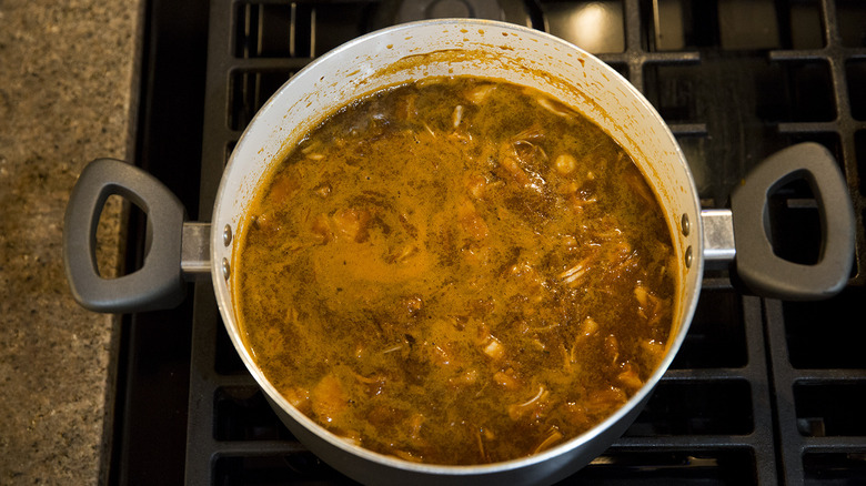 - Pour the tomato mixture back into the saucepan and add the rest of the broth or water, salt, black pepper, and the jackfruit.