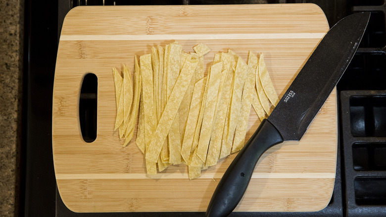 - Meanwhile, stack the tortillas and cut them into strips about ⅜ inch wide.