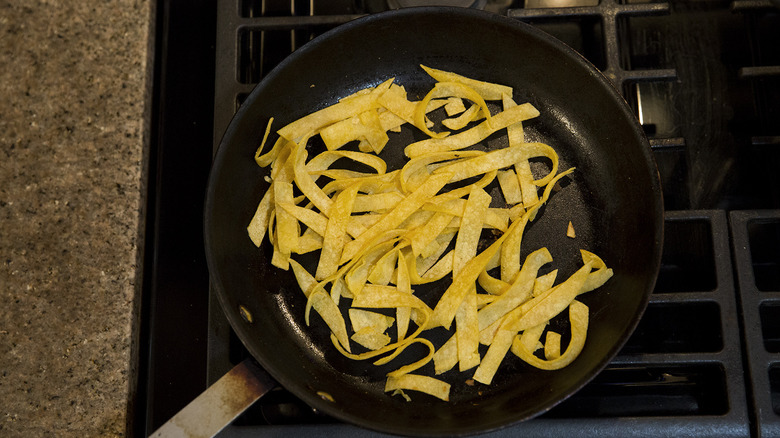 - Fry the tortilla strips for 6-8 minutes, stirring occasionally, until golden and crispy. Set aside.