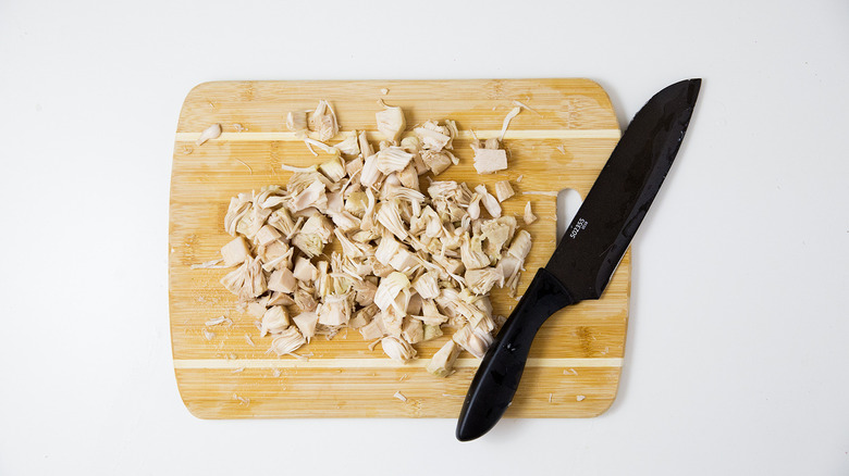 - Remove the V-shaped cores of the jackfruit pieces with a knife and chop them into small pieces. With your fingers pull apart the stringy parts of the jackfruit pieces until they resemble pulled pork or chicken.