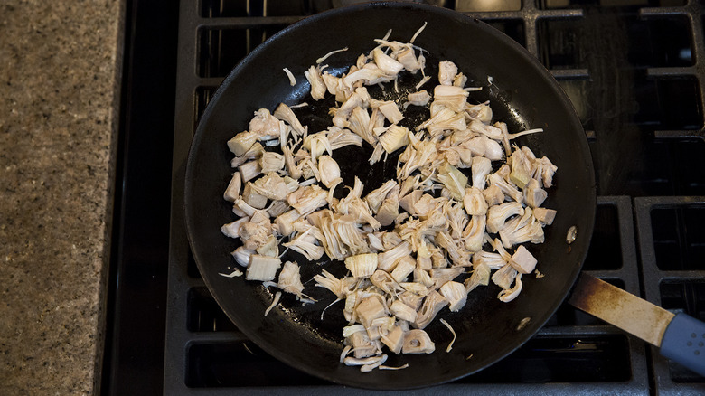 - Add the jackfruit to the pan and saute for 5-7 minutes, stirring frequently, until it starts to dry out and brown. Remove from heat and set aside.