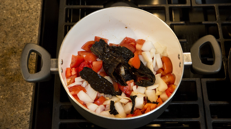 - Heat ½ tablespoon oil in a large saucepan on medium. Add the chiles, tomatoes, onion, and garlic and saute for 6-7 minutes.