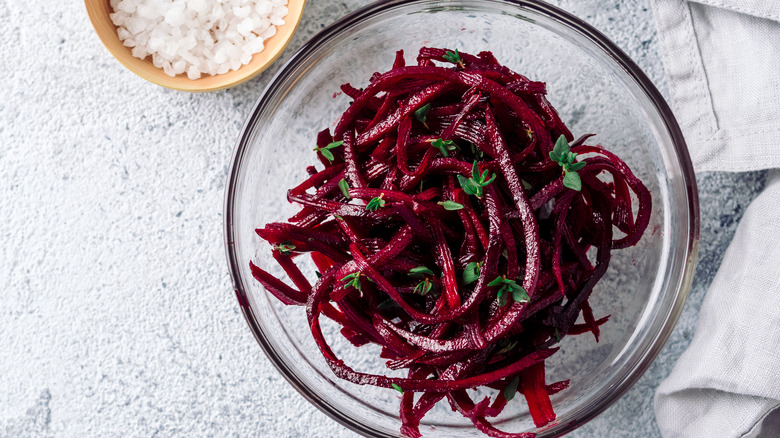 Sauteeing the "noodles" works for beets, as well. It doesn't take that long for the hardness to give way to a softer texture, although the beets remain somewhat al dente. It's possible to steam the spiralized beets, instead. This way, they mirror the tenderness of actual pasta. You can either use a steam basket or cover the bottom of a pot with water and place the vegetables in. Beets have an earthy, sweet flavor that works well with bright and nutty ingredients, as seen in this bewitching beet ravioli recipe. Toss your sauteed spiralized beets with lemon and garlic, or goat cheese, balsamic vinegar, and walnuts.
