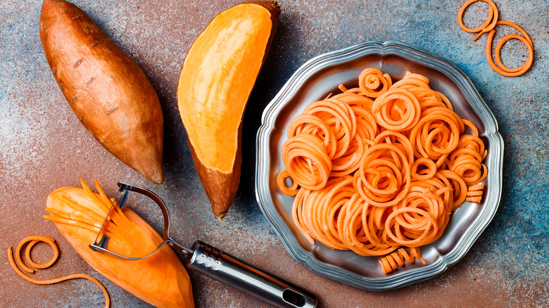 To turn your veggies into noodles, cut off both ends and peel away the skin. An automatic countertop spiralizer works best for root vegetables since you won't have to do much — just place them on the machine and let it work its magic. If you're using a handheld tool, or a countertop spiralizer with a handle, you'll need to put a little more muscle into cutting the vegetables because they're hardy. Even without a spiralizer, root veggies can be turned into pasta. A julienne peeler or mandoline with a julienne blade works just fine. A regular peeler can be used too, but you'll have to cut the peeled vegetables into thin slices to mimic noodles, which will be a bit more difficult.