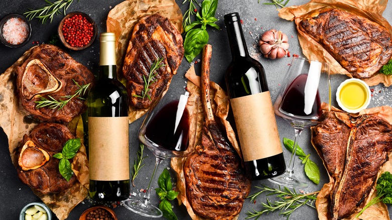 When thinking about the best wines to pair with steak, those wines have two different criteria to meet. They must meet the intensity of the meat itself while cutting its umami and fat with tannic astringency and acidity, and they must do the same for any of the classic steak sauces to create compare-and-contrast moments with the chosen sauce's different elements. Syrah is up to all of these tasks, as its grapes are packed with tannins, which provide astringency and acidity that act like a palate cleanser. Take a bite of juicy, rich steak, and then let a sip of syrah balance that with a bright burst. The wine's fruit notes are a lovely match for any sweet, caramelized edges on the steak too.