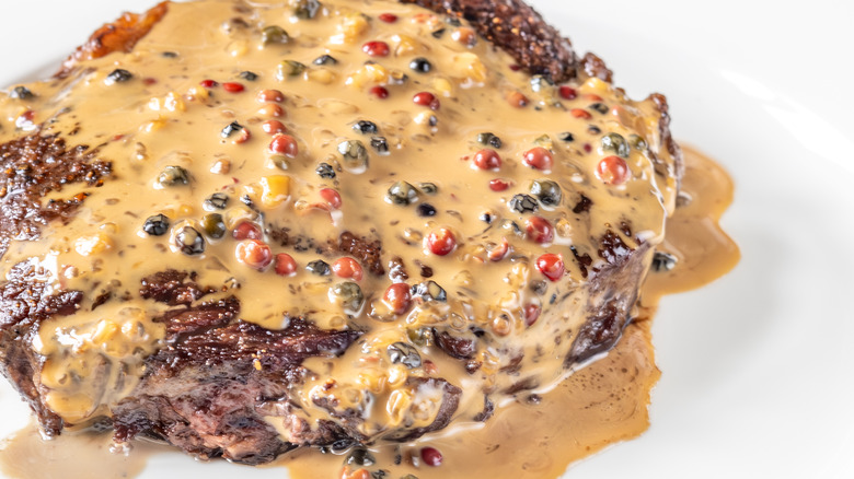 The number one rule for pairing food and wine is to match intensity — the flavors and body of both should be equally light, medium, or bold so that one doesn't just drown out the other. Further professional-level food and wine pairing tips include choosing more acidic wines so they cut through characteristics like richness and umami, and considering flavors in a compare-and-contrast way. Common flavors make for harmonious pairings, but you also want differences, which create a mutual highlighting between the food and wine. A pairing that deliciously checks all of these boxes is steak au poivre and syrah. Take it from an expert like executive chef of Fort Lauderdale's Steak 954, Matthew Kreider, who picked the syrah when we asked what would live up to steak au poivre's boldness. Kreider's reasoning is that "the structure of the wine should hold up to all the spices and big flavors [of] an au poivre sauce."