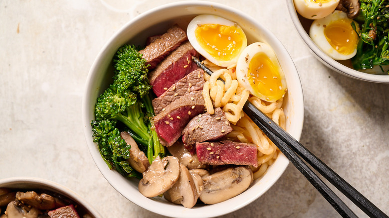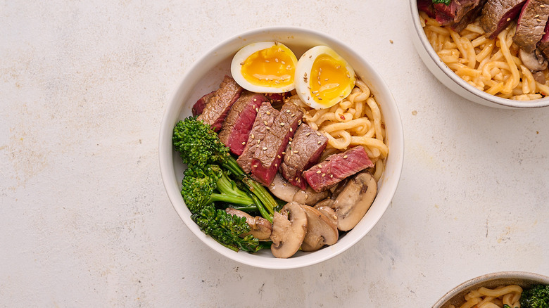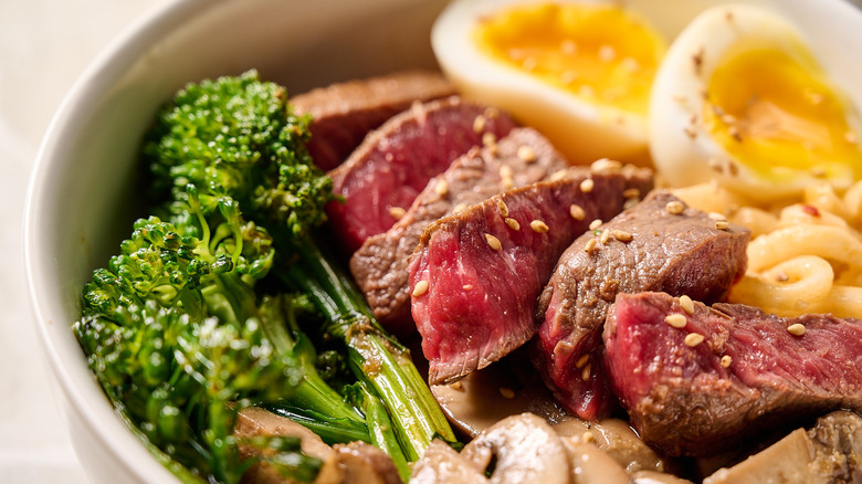 - Add the vegetables, eggs, and steak to the noodles in the bowls to serve. Optionally garnish with sesame seeds.