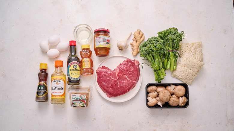 Gather the ingredients for this miso sesame beef noodle bowl