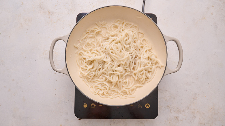 - Add the udon noodles to the skillet with ½ cup water. Gently toss over medium heat until noodles separate.