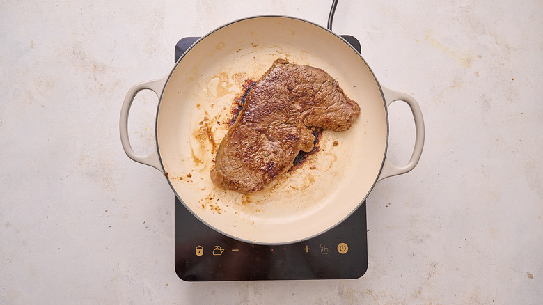 - Add the steak to the skillet, adding more oil if needed. Sear on either side until browned, about 2 minutes per side.