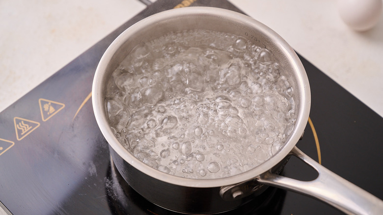 - In the meantime, make the eggs. Fill a saucepan with 3 inches of water and bring to a boil over medium heat.