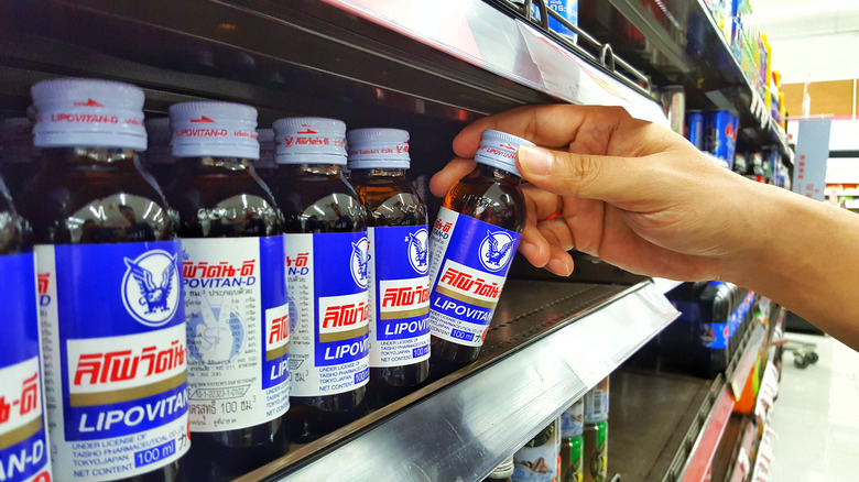 In 1962, Taisho Pharmaceutical Company introduced Lipovitan, a caffeinated herbal energy tonic. Lipovitan also contained taurine, a naturally occurring, antioxidizing amino acid that's prevalent in almost all modern-day energy drinks. Interestingly, taurine isn't a stimulant itself, but it's believed to reduce the anxiety associated with consuming higher quantities of caffeine. Lipovitan is sold predominantly in Asia under a variety of names and with a few different versions available. The standard product — Lipovitan-D — comes in a 100-milliliter bottle that contains 50 milligrams of caffeine and 1,000 milligrams of taurine. It also contains 5 milligrams each of vitamins B12 and B6, as these help our bodies metabolize sugars into energy, increasing the drink's effectiveness.