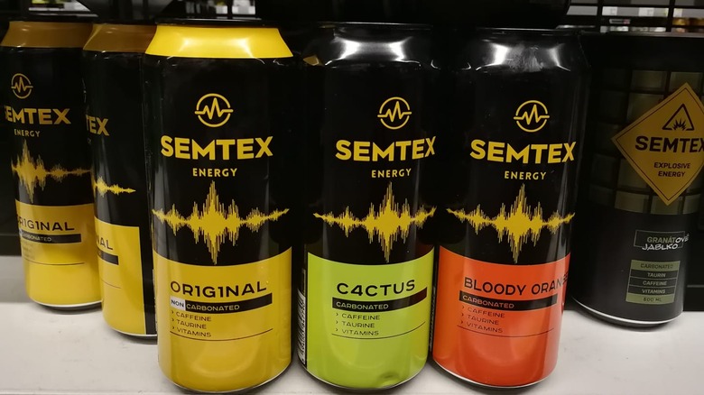 Semtex was named after a type of plastic explosive that was also invented in Czechoslovakia, but the legal issue it faced wasn't due to the violent nature of its namesake. Rather, Semtex is a trademarked name. It took some time for the drink's manufacturers to make a financial settlement with the creator of the explosive, but it was eventually permitted to continue using the Semtex name. It wasn't the only one to hit this snag either — some years later, pop superstar Madonna encountered the same legal pushback after attempting to create a company called Semtex Girls Ltd. The energy drink is still going strong today, with plenty of tasty flavors, and non-carbonated and sugar-free alternatives also on offer. Semtex comes in 250- and 500-milliliter cans, with 32 milligrams of caffeine and 400 milligrams of taurine per 100 milliliters. There's also an "Extreme" version that boosts the stimulating properties by swapping the taurine for 10 milligrams per 100 milliliters of guarana extract.
