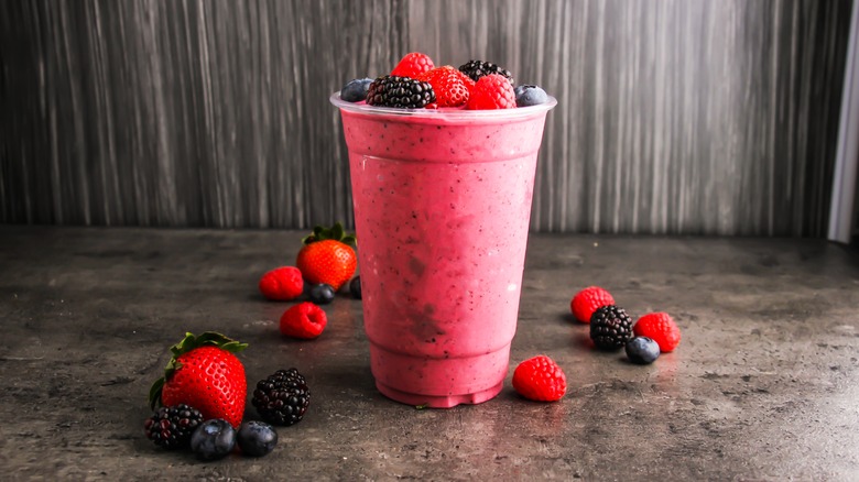 Turns out, there's real fruit in the Costco food court smoothie, including a berry mixture of strawberry, blackberry, and açaí — at least four servings of it — and no added sugar. There are also no added flavors or coloring. That means the smoothie's mauve coloring comes naturally from all the blended fruits. And, there's a base in the smoothie and it's not frozen yogurt. Instead, it's made from a puree of fruit juices, including apple, pear, and pineapple. Costco's well-received food court fruit smoothie is dairy-free and contains 230 calories.