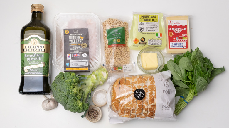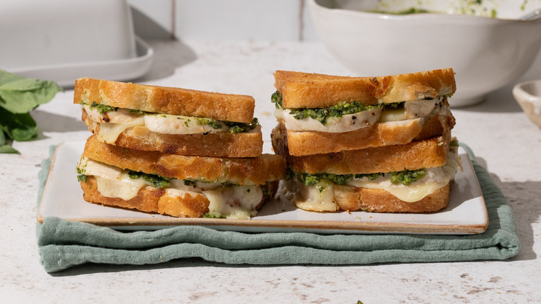 Gather the ingredients for this chicken and broccoli pesto grilled cheese sandwich recipe