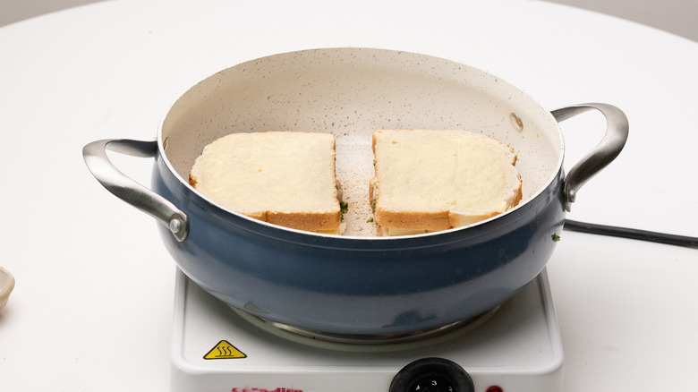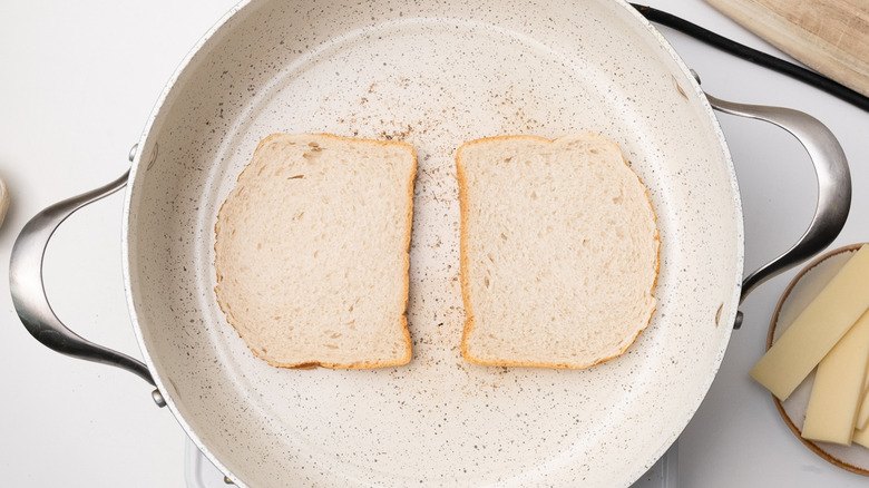 - Place two of the slices of bread, buttered side facing downward, into a large pan.