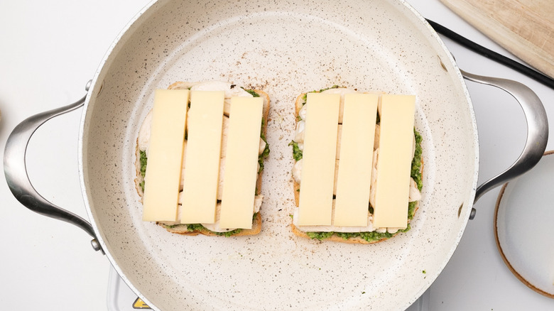 The unique, nutty and creamy flavor of Gruyère makes the ideal accompaniment to the chicken and broccoli pesto in this grilled cheese, but if you are unable to get your hands on this particular cheese from Switzerland, there are plenty of other options available to you. Mozzarella is always a wonderful option for grilled cheese, as well as being a classic accompaniment to pesto. Its mild flavor and wonderful capacity for melting into a delicious stringy goo makes it a worthy substitute. If you prefer more sharpness in your grilled cheese, cheddar is a classic choice that will similarly work well with the other flavors in this sandwich. However, if you fancy something a little more, well, fancy, swap in Brie for a punchier flavor and it's wonderfully gooey melting qualities.
