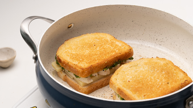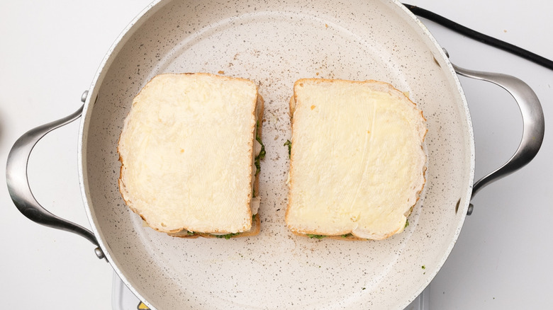 - Heat the pan to a medium heat and gently toast the sandwich for 3 to 4 minutes until golden brown underneath.