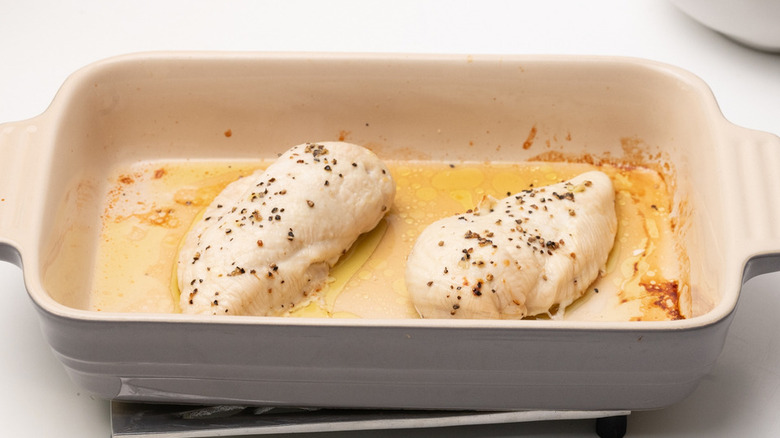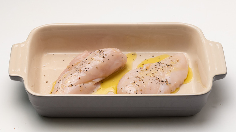 - Place chicken breasts into an oven-safe dish, drizzle with 1 tablespoon olive oil, and season with salt and pepper.