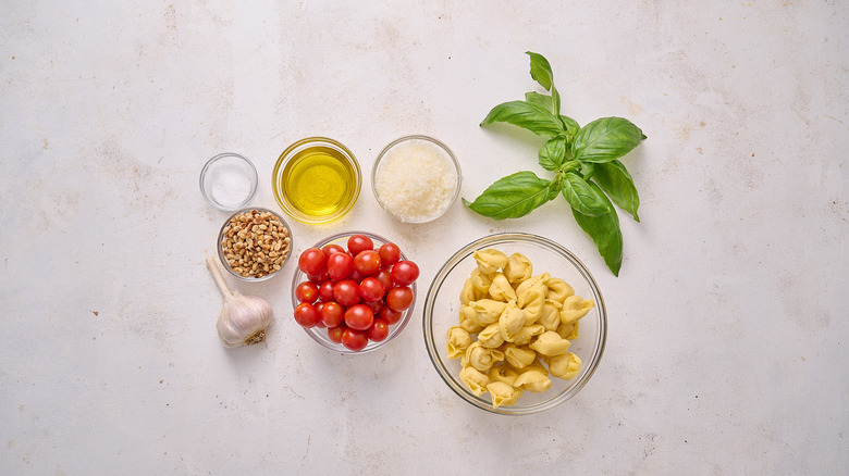 An ingredient list as short as the recipe is easy: You'll just need cherry tomatoes, basil, olive oil, garlic, freshly grated Parmesan, salt, and toasted pine nuts. For the nuts, you can use untoasted or toast them yourself in a skillet over medium-low heat. To finish the recipe, choose a tortellini. Look for fresh tortellini in the refrigerated aisles — the most common kind is cheese (or 3-cheese) stuffed, but you can also use spinach-stuffed, Italian sausage-stuffed, or even prosciutto-stuffed tortellini.