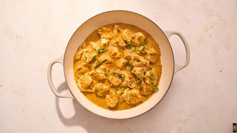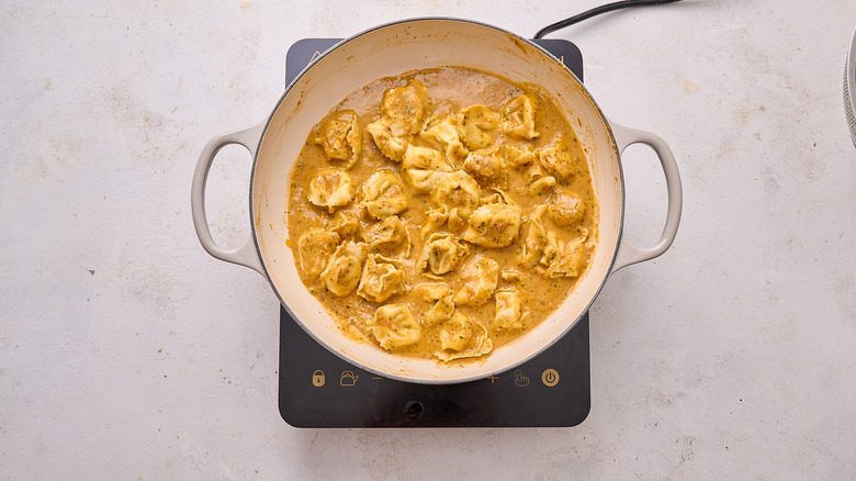 - Once the pesto begins to simmer, add the tortellini and toss to combine.
