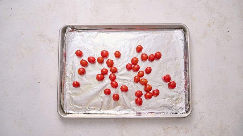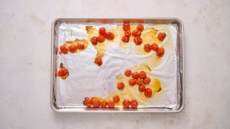 - Add the cherry tomatoes to a foil-lined sheet tray and drizzle them with 1 tablespoon olive oil.