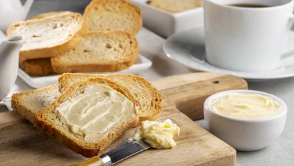 First, make sure you store your butter at room temperature. A lot of people will pop a stick in their fridge which is fine for baking, or cooking, but when it comes to spreadable butter, you'll want to keep some out on the counter. Next, place ½ cup of room-temperature butter in a bowl and add 2 tablespoons of milk. Then all you have to do is whip until your arm starts to quake in pain (or about five minutes). If you're not looking for an arm workout, you can use your stand mixer; beat on low for one to two minutes, scrape any crawling butter off the sides of your bowl, and then beat on high for another two to three minutes.