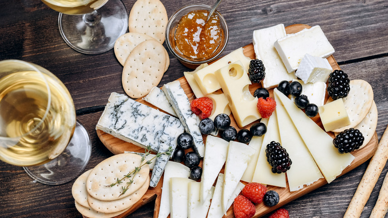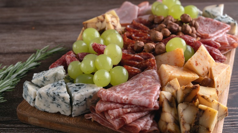 The good news is that if your local stores don't stock ready-made charcuterie boards, it's easy enough to make your own. The chain has a rich stock of food and ingredients; just learn about the fresh produce must-buys at Costco and which to skip. Be particularly wary of berries that are perishable and damage easily from handling. Otherwise, look for tasty fruit, cured meats, and a mixture of cheeses (gouda, Brie, and aged cheddar are the most popular). Crackers are an absolute must and dips are optional. A sliced baguette is a nice touch for a more filling spread. And, if you want to splurge a little, you could save your time hand-selecting cheeses and purchase a $19.99 Costco cheese flight.