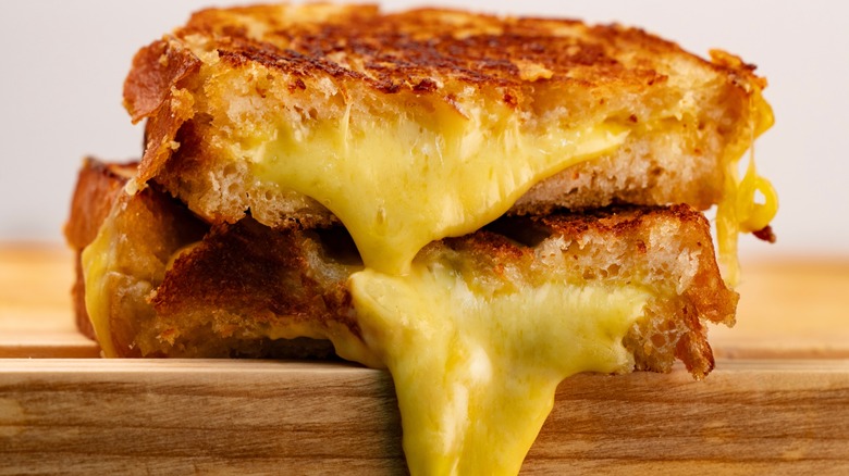 For several reasons, gruyere is a dream choice for grilled cheese. It melts really easily, so it's a top pick for that cheese-pull action. This Swiss cheese is hard, so it may take grating or shaving to get a quick melt, but once it meets heat and starts to ooze, it does so beautifully. That's because it's curdled with rennet, a combination of enzymes that helps cheese melt more readily than the alternative of acid, and because it has a high water-to-oil ratio it melts evenly. For this reason, gruyere is a must for French onion soup as well as cheese fondue and the classic croque monsieur. When it melts, it's creamy, bringing out its nutty sweetness. However, that flavor profile is also its problem for grilled cheese.