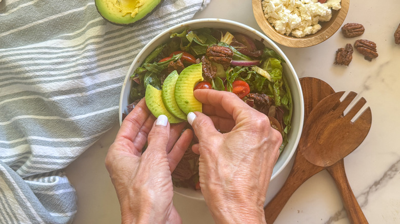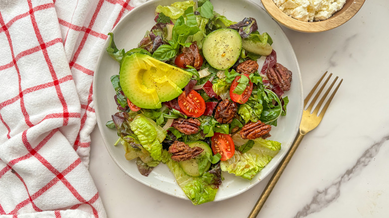 - Add the avocado, pecans, and optional feta cheese to the salad and serve.