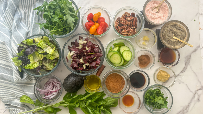 If you are planning to make this salad for a dinner party, there's a good chance that you've got quite a few other courses to worry about as well. So, checking the appetizer off your list ahead of time will certainly relieve some stress. To prepare this salad ahead of time, it is best to make the individual components, so they are ready to assemble right before serving. To start, make the candied pecans as outlined and store them in an airtight container at room temperature for up to five days in advance. The dressing is another item that can be made up to five days ahead. You'll want to store it in the fridge in an airtight container. A mason jar with a lid allows you to quickly shake it before needed.