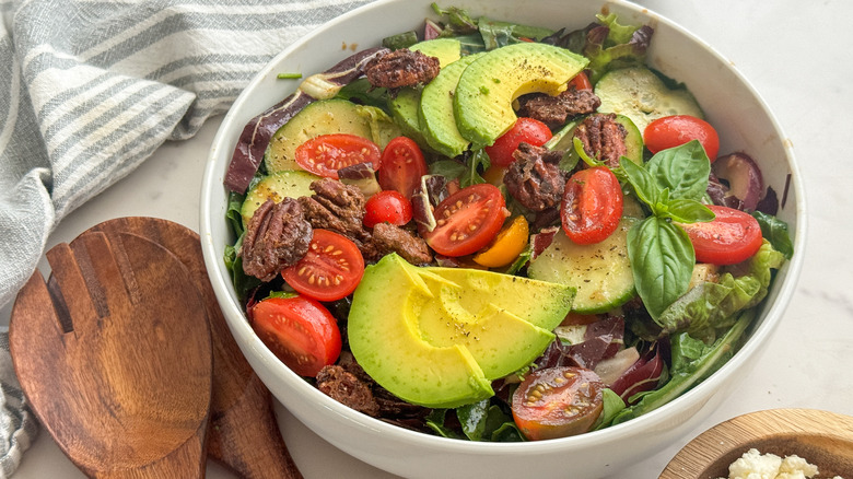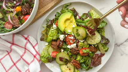 Salads are a side dish staple, and a beautifully presented salad can turn a simple entree into a gourmet occasion. One of the key factors in pulling off a show stopping salad is using a mix of lettuces and other colorful ingredients to add a variety of textures. In this recipe, we're highlighting delicate baby gem lettuce, spicy arugula, and hardy purple radicchio as the base, and complementing the lettuces with juicy grape tomatoes, crisp English cucumber, creamy avocado, and the freshest of herbs. The homemade candied pecans roast with brown sugar, maple syrup, cinnamon, and vanilla to balance out the tangy balsamic dressing and add a sweet and salty crunch, truly making for a show-stopping salad.