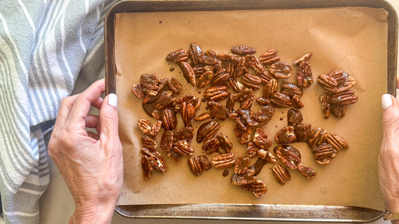 - Lay the pecans out on the prepared sheet pan and bake for 15 minutes, stirring halfway. Cool for 10 minutes.