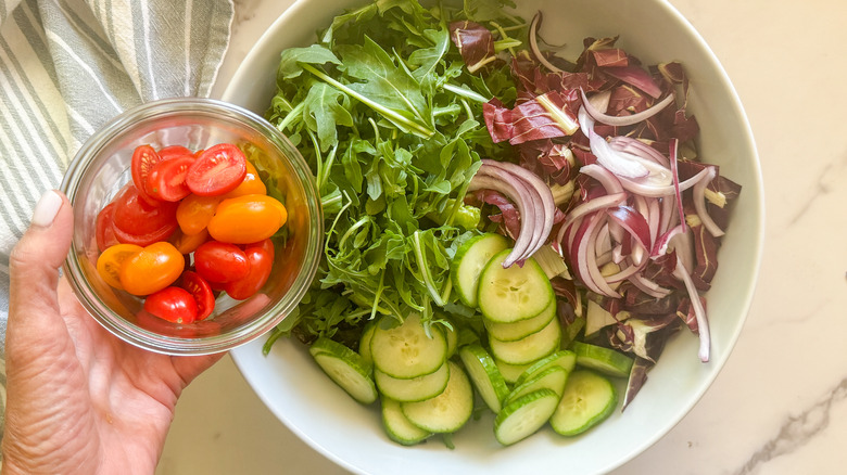 In a large bowl little gem lettuce, arugula, radicchio, cucumber, tomatoes, red onion, basil, and parsley.