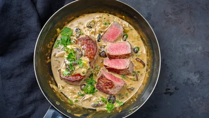 Originating in London in the 1930s and supposedly named after a Greek goddess, steak Diane has now become synonymous with fine dining and tableside theatrics. After searing a fine cut of steak, the juices and butter left in the pan are used to build a rich sauce of shallots, garlic, mustard, cream, Worcestershire sauce, veal stock, and often mushrooms. A splash of brandy explodes into an impressive flame as it hits the hot pan for that final flambeed finish. The complex sauce is usually left to the professionals at your favorite steakhouse, but there's a canned ingredient to help you easily prepare steak Diane at home.