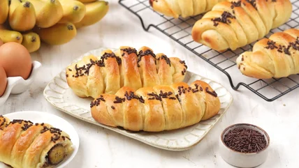 After taking the banana out of the peel, scoop the center out with a spoon. You won't be needing it for the rest of the recipe, so feel free to use it for overnight oats or toss it into a banana matcha smoothie. Line the empty space with chocolate chips or chopped up chocolate bars then bring out the crescent dough. Roll it out until it's thin then wrap them around the bananas. Brush the tops of the dessert with egg yolk and stick it in the oven at 350 degrees Fahrenheit. Bake them for 15 minutes or until the crescent dough is golden brown.