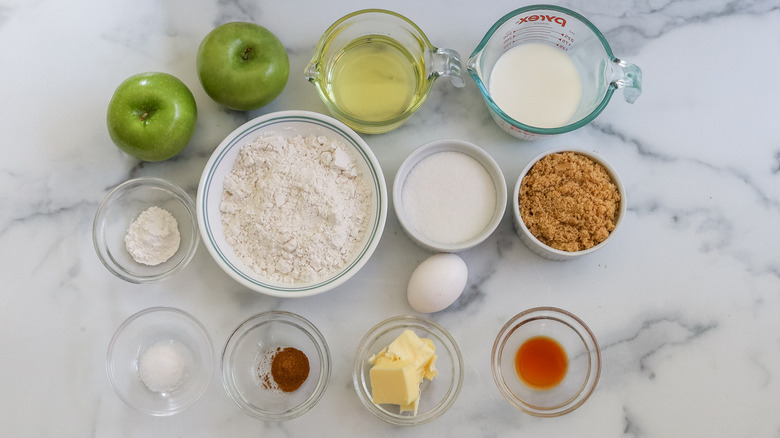 The cake batter is made from vegetable oil, granulated sugar, milk, egg, vanilla extract, flour, baking powder, salt, and apple pie spice. The upside-down topping consists of brown sugar, salted butter, and sliced apples (Granny Smiths would be best).