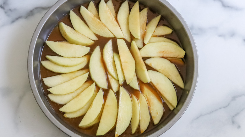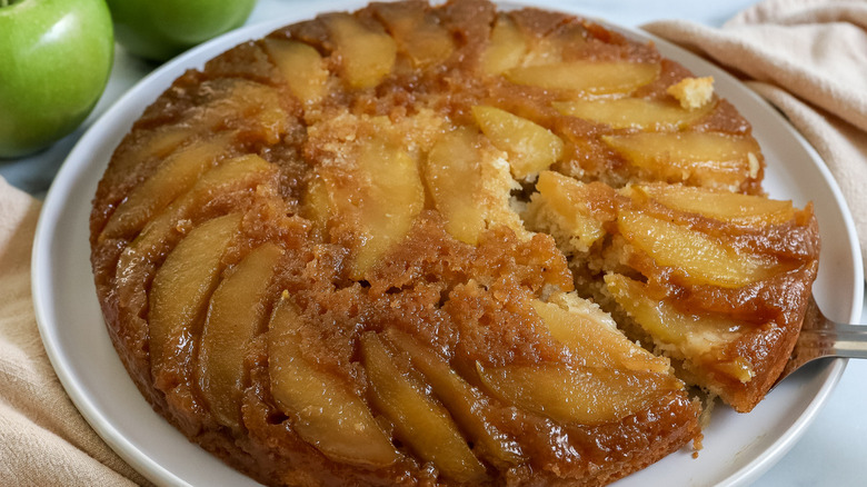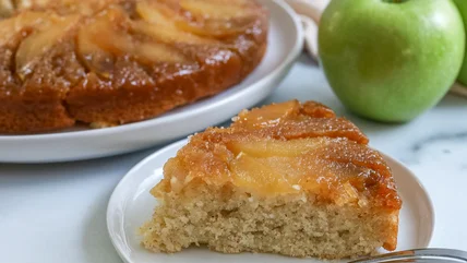 You can use a variety of fruits as the base of an upside-down cake. Here, we merge homemade salted caramel with apples for a autumnal treat.