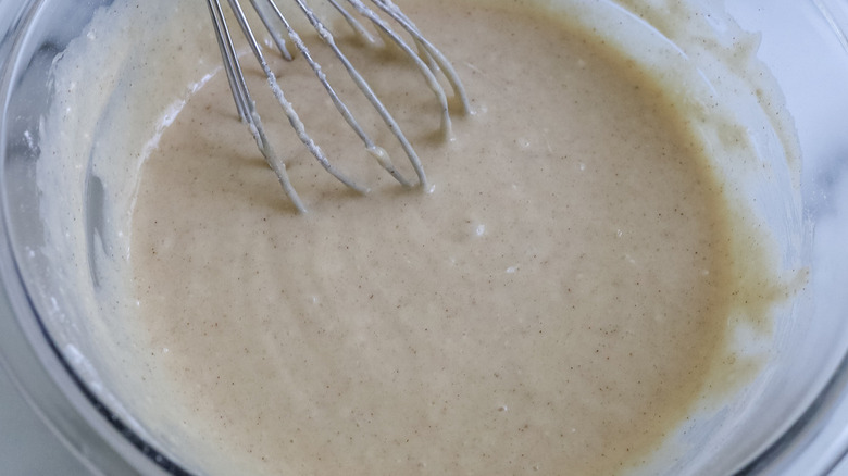 - Add about half of the flour mixture and half of the milk into the bowl with the wet ingredients and whisk until combined. Repeat with the rest of the flour and milk.