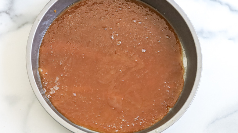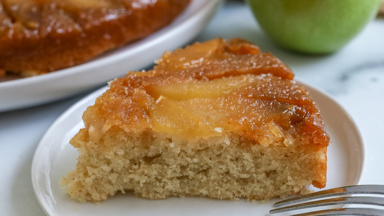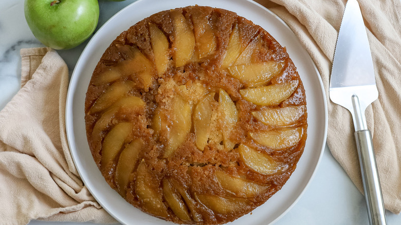 An upside-down cake's appeal lies in how pretty it looks, so you'll want to take every precaution to make sure that it doesn't stick to the pan. This starts with not only greasing the pan but lining it with paper and greasing that, too. (Because the pan liner is entirely covered with batter, it's okay to use wax paper instead of parchment, although this material can't be exposed to direct heat.) It's also important to flip it at just the right time — the pan needs to be cool enough to handle, but the cake must still be warm. When you flip, do so as quickly as possible, since this will help to keep the cake intact.