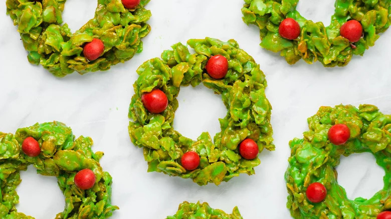 Corn Flakes won't give you the most Rice Krispies-adjacent shape, but they do give you a ton of room to experiment (like in a batch of wintery Christmas wreath cookies). The crunch of the cereal is immaculate and makes for a truly excellent base for flavored marshmallows, including seasonal peppermint ones.
