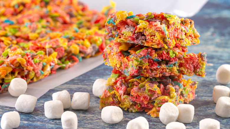 We can all use something sweet in our lives. After all, that's why you'd want to make Rice Krispies treats, right? But instead of reaching for a box of plain and bland rice cereal, grab the fruitier and more fun version instead in Fruity Pebbles. Not only will Fruity Pebbles make the color of your treats absolutely whimsical, but it'll also turn up the sweet flavor — a lot.