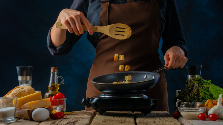Whether you're preparing them in a skillet, on a baking sheet, or in your air fryer, leave a little space between your croutons for best results. It's better to cook them in smaller batches than try to cook too many all at once. This is why most recipes instruct cooks to spread the croutons in one even layer.